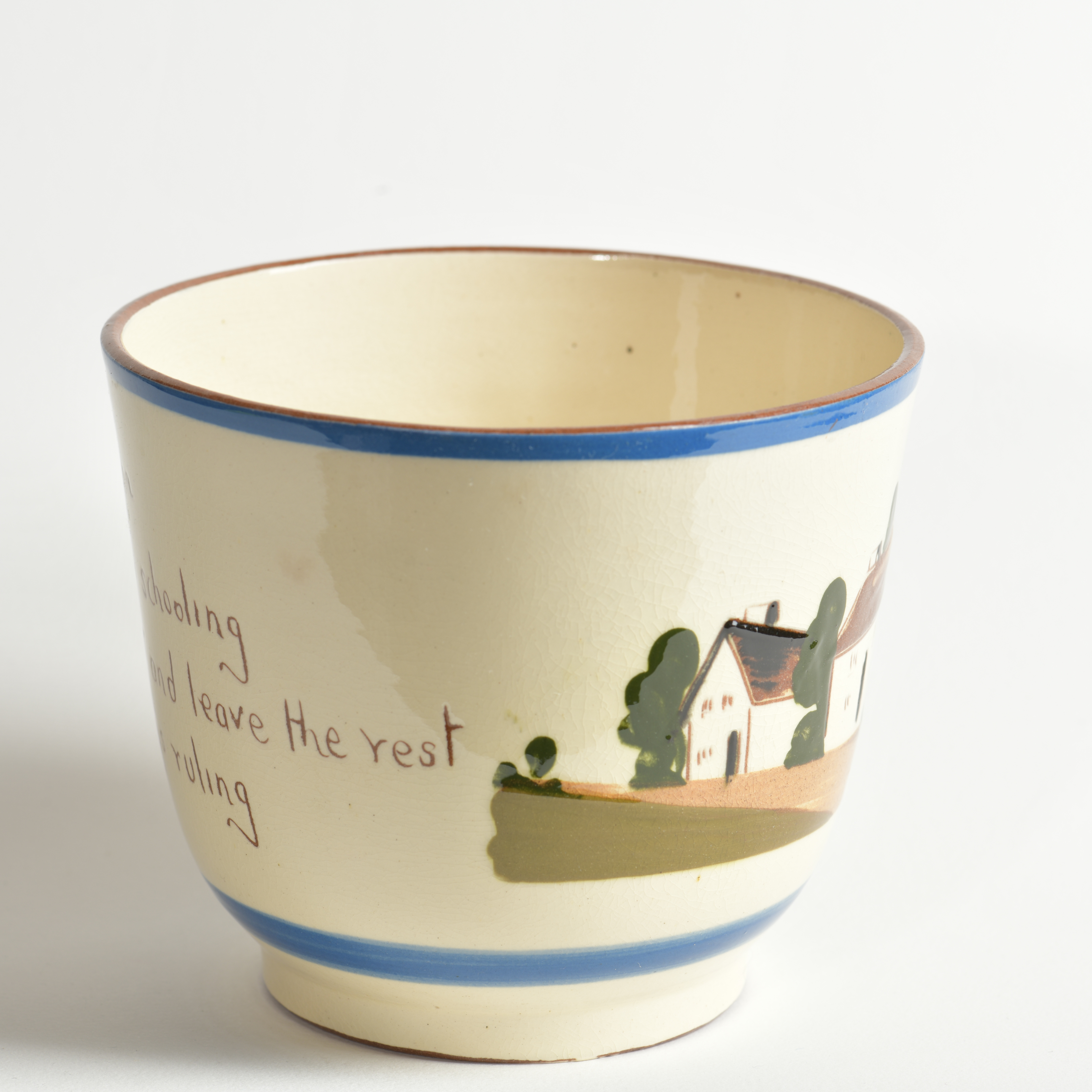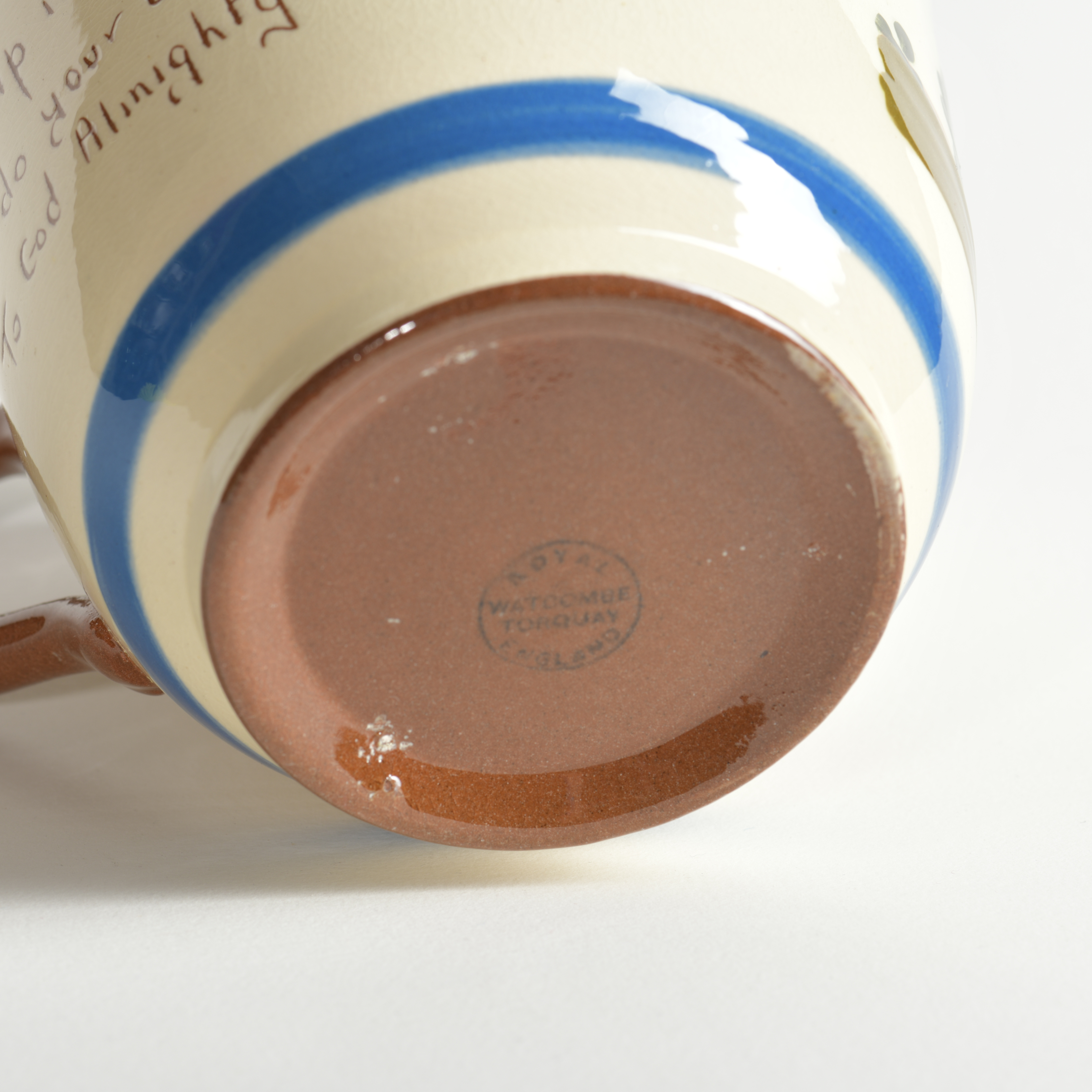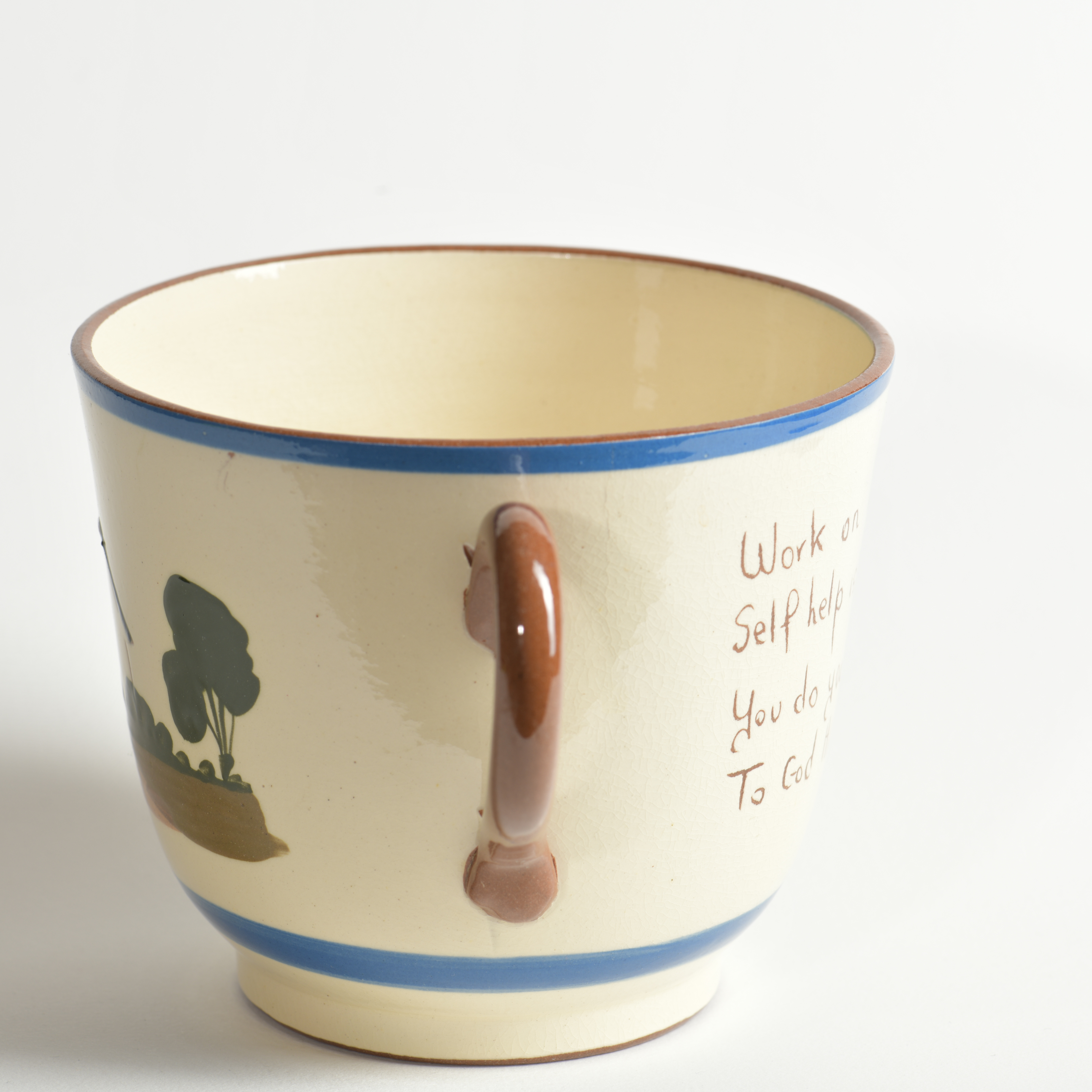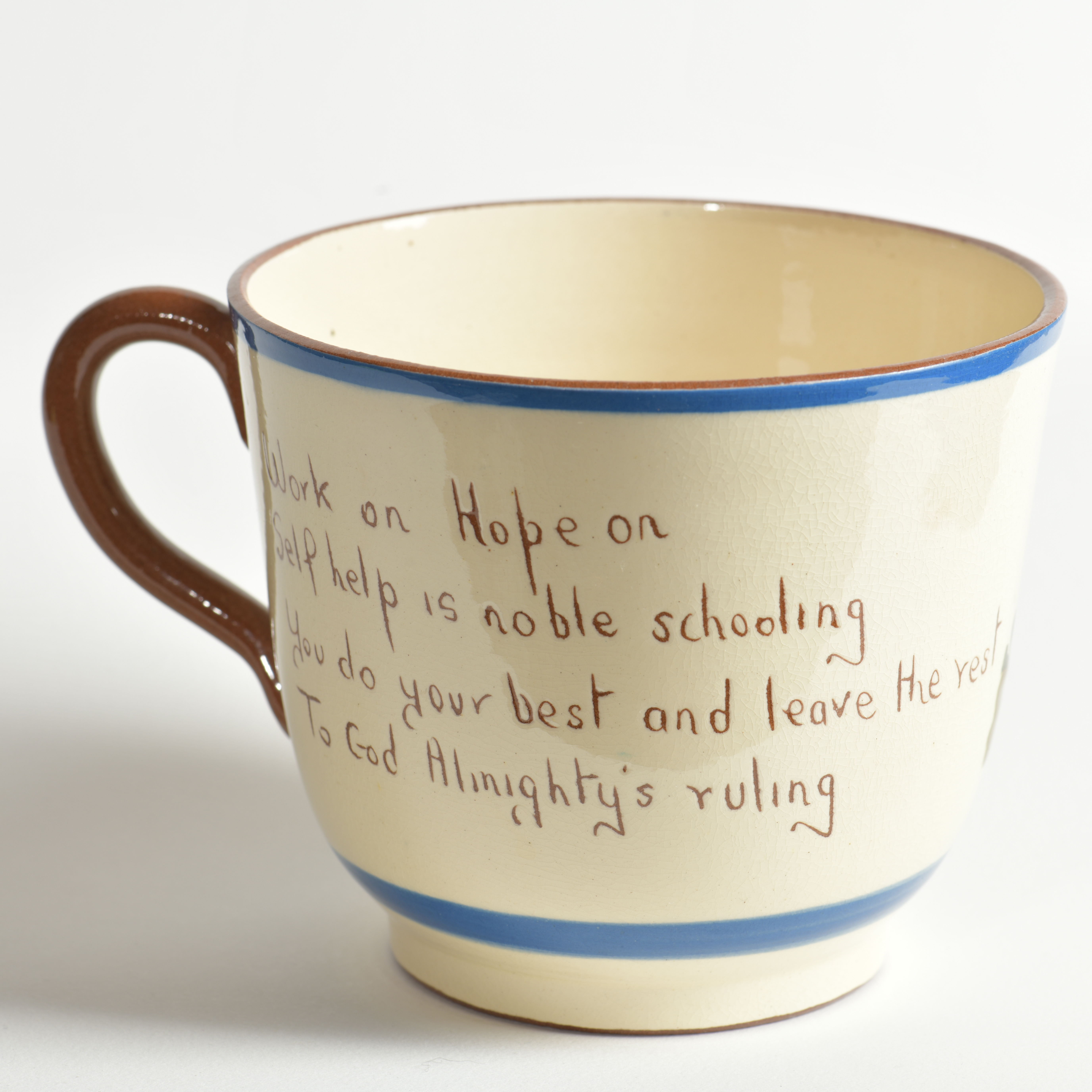 Torquay ware large mug – Royal Watcombe, Torquay England. Text reads: "Work on Hope on Self help is noble schooling You do your best and leave the rest To God Almighty’s ruling. House design." Please note: Base 8cm, top 13cm wide, excluding handle. The surface is crazed as it is an old piece. |