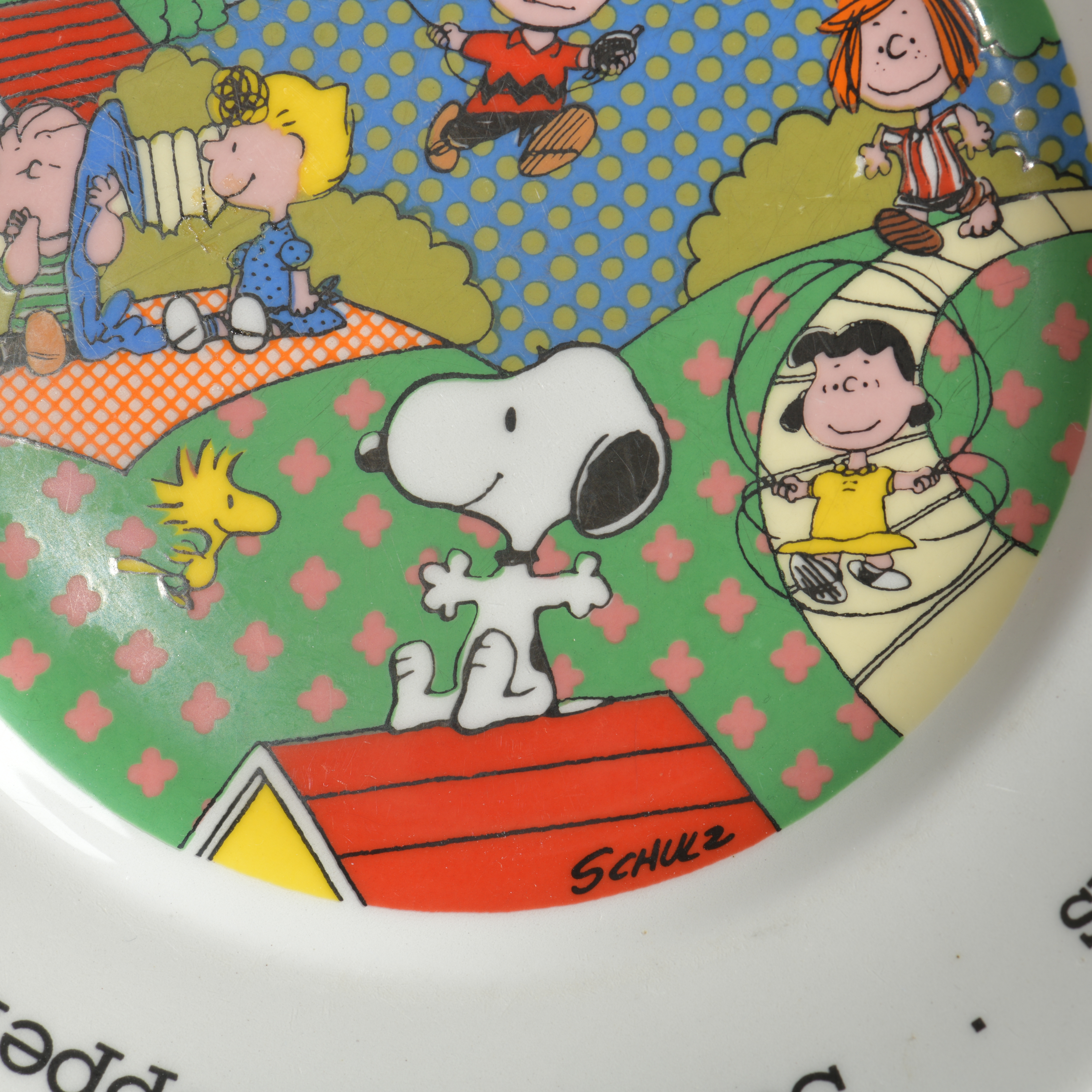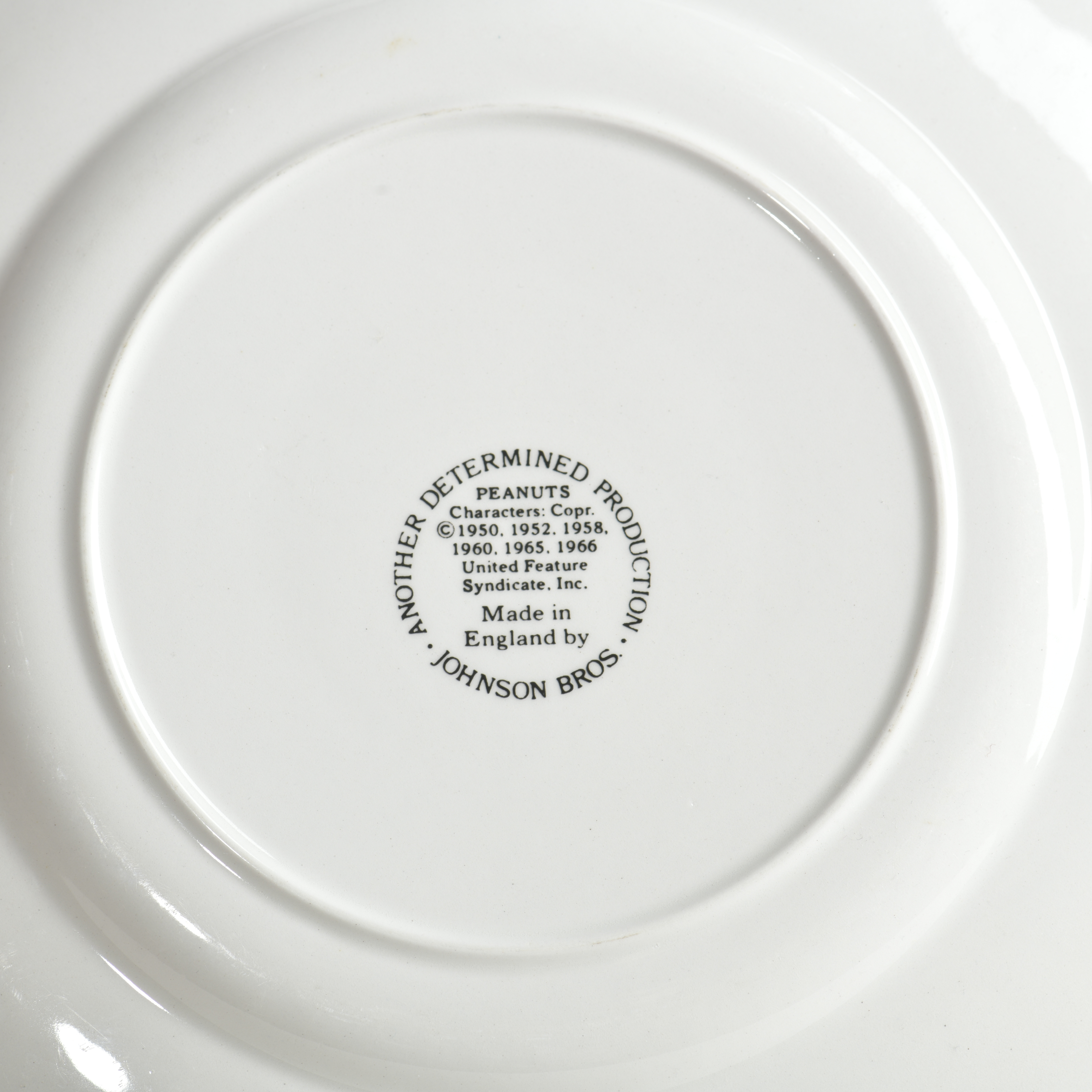 Fabulous nostalgic piece of Peanuts china showing Snoopy and all of the gang. The names of the characters are written around the rim of the plate. Made by Johnson Brothers in England.
