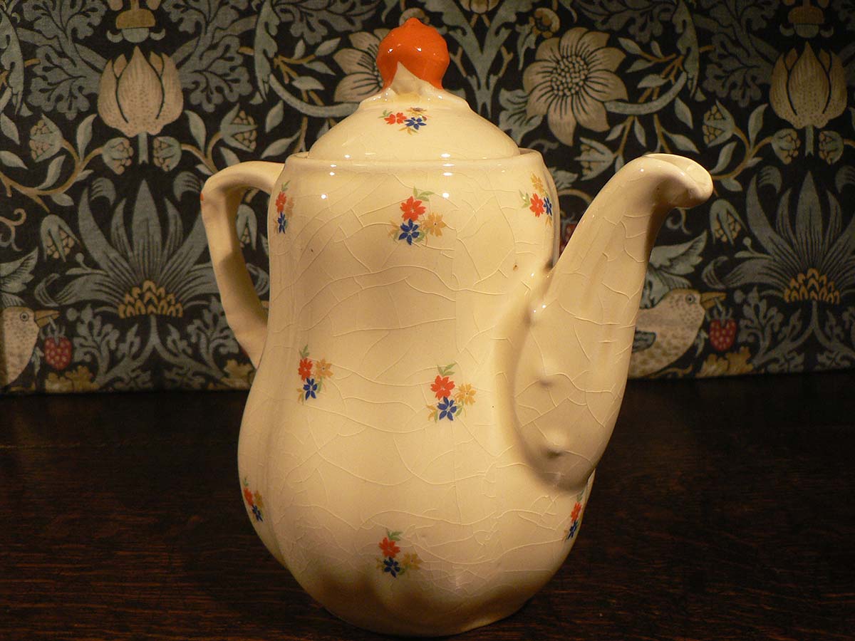 Pretty floral teapot made by Ditmar A-G in Teplitz-Schönau in Czechoslovakia. It was made in around 1910. It has a crazed surface but is very stylish with a yellow base colour and pretty bunches of flowers adorning the teapot.