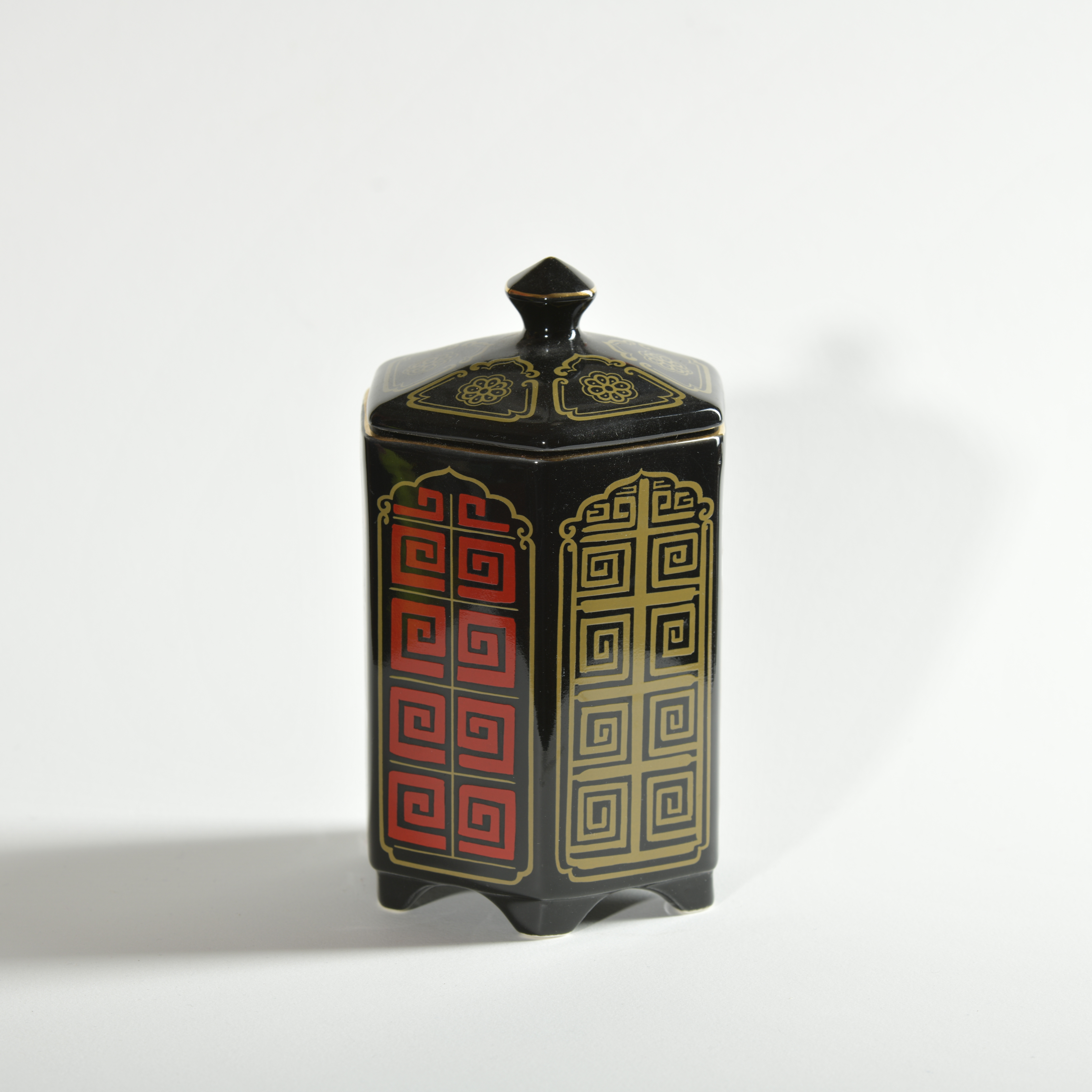 Black, red and gold with Japanese design. Very attractive and would look great on your kitchen bench.