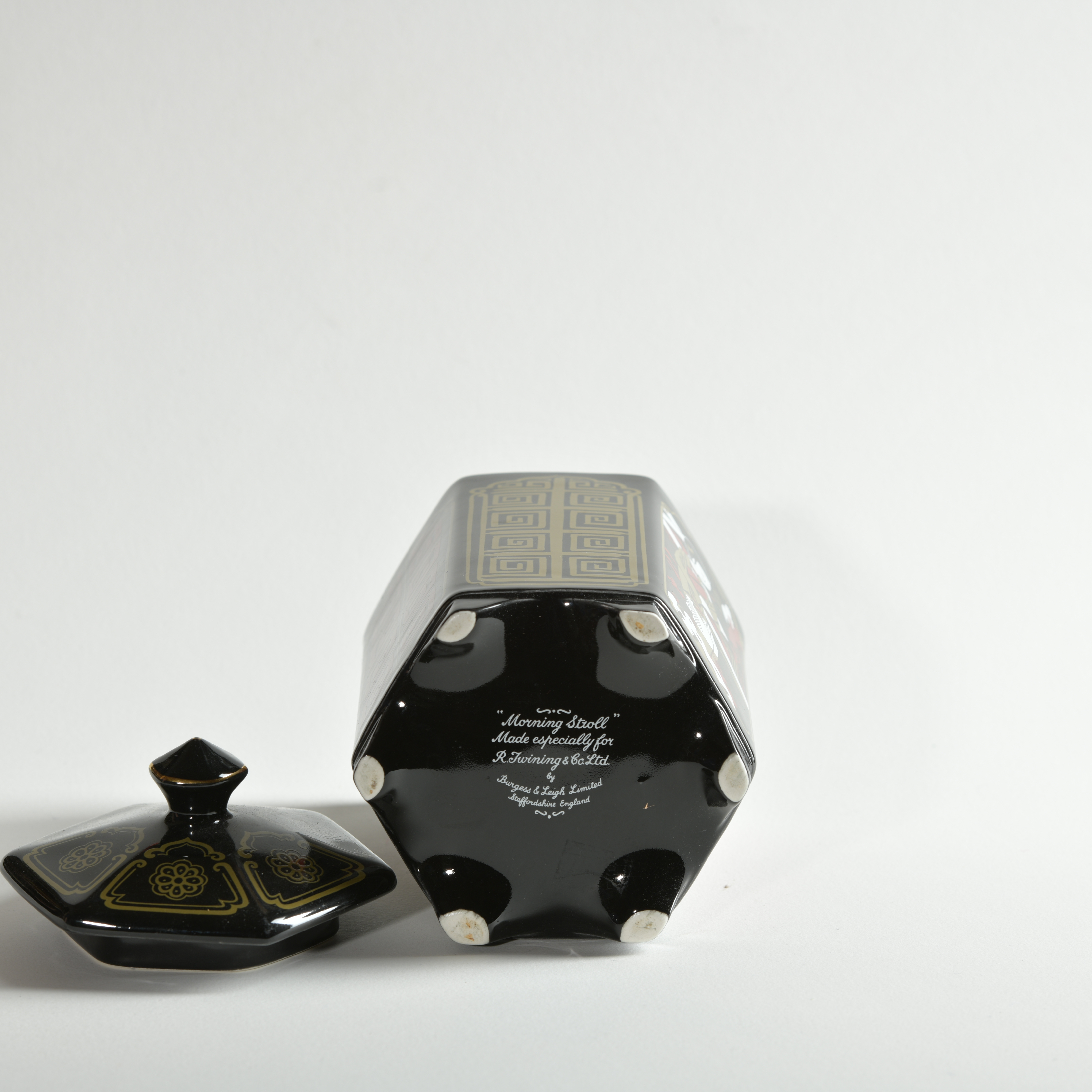 An unusual Twinings Tea canister, hexagonal – titled “Morning Stroll".